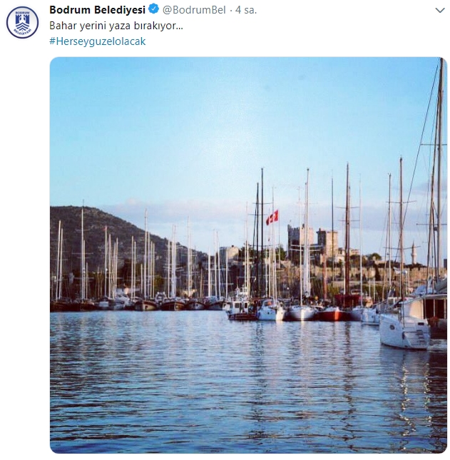 Bodrum Belediyesi ise bir manzara fotoğrafı paylaşarak "Bahar yerini yaza bırakıyor" ifadelerini ve #HerşeyÇokGüzelOlacak etiketini kullandı.