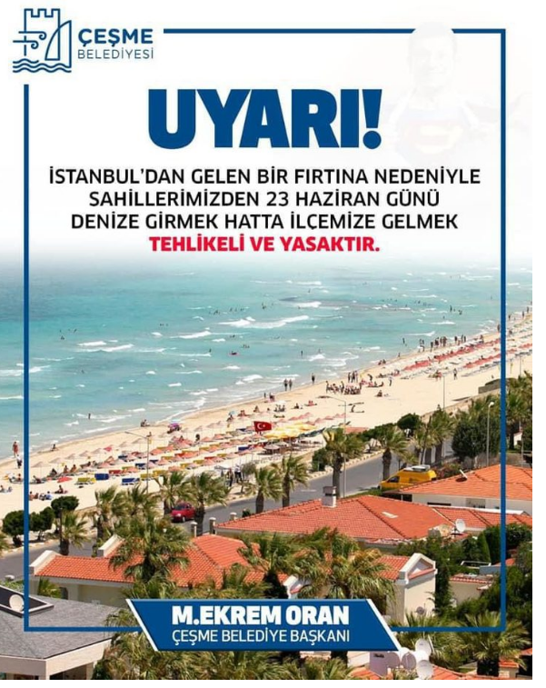 Çeşme Belediye Başkanı Ekrem Oran İstanbul’da seçmin yapılacağı 23 Haziran’da denize girmenin hatta ilçeye gelmenin yasaklandığını duyurdu.