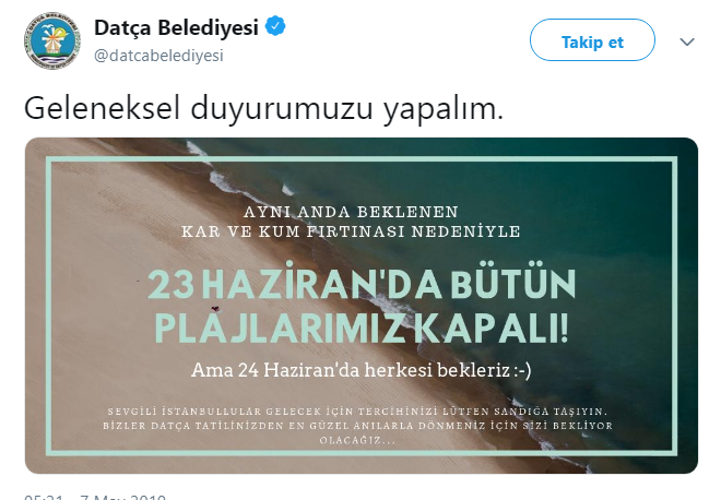 Datça Belediyesi, resmi twitter hesabından yapılan açıklamada 23 Haziran'da İstanbul'da yapılacak olan büyükşehir belediye başkanlığı seçimleri için plajlarını kapatma kararı aldığını duyurdu.