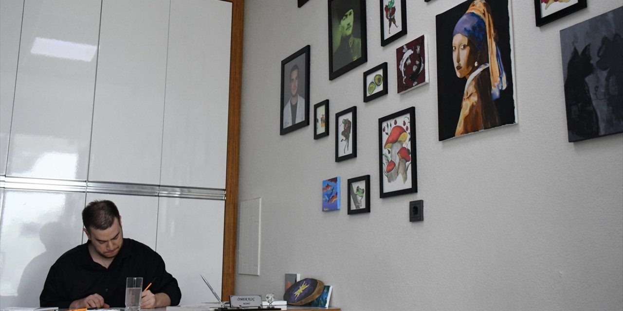 Düzce'de ilkokuldayken resimle tanışan eczacı Ömer Koç, bu tutkusunu iş yerinin duvarlarını eserleriyle süsleyerek yaşatıyor