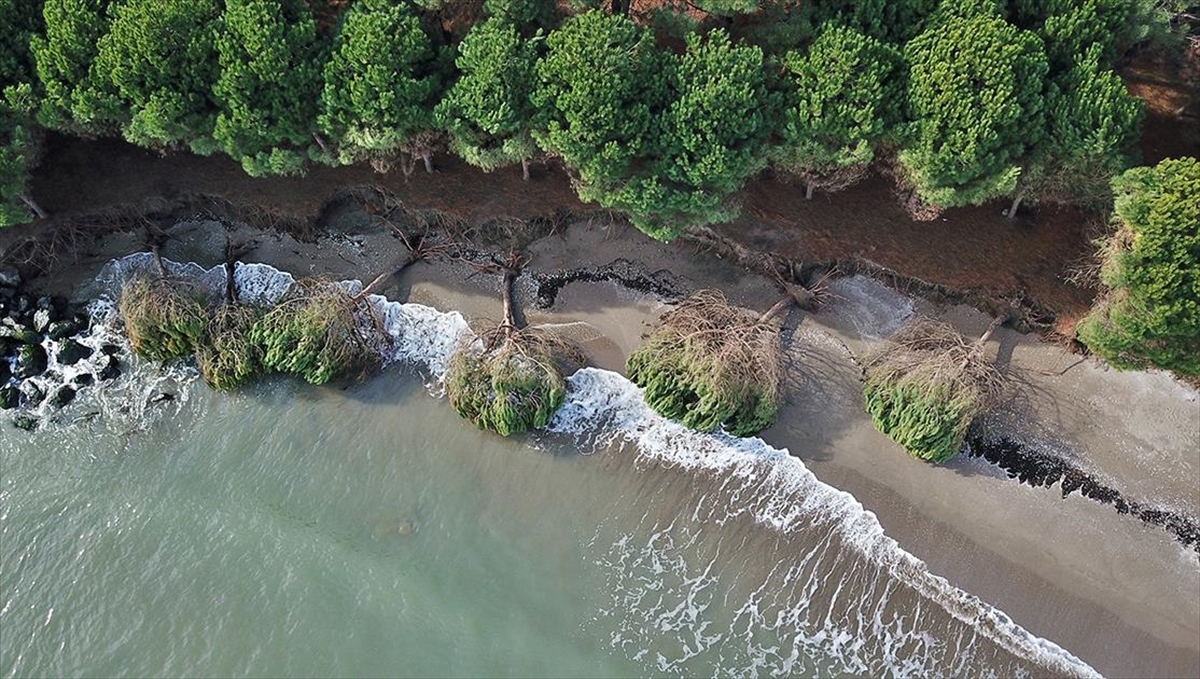 Kıyı erozyonu nedeniyle çam ağaçları kökünden denize doğru devrilirken dalgalar sahil yoluna yaklaştı.
