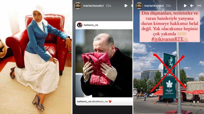 Cumhurbaşkanı Tayyip Erdoğan’ın danışmanı, AKP’li Merve Kavakçı’nın kızı Mariam Kavakçı, Instagram hesabından “Halifemiz Erdoğan” paylaşımı yaptı. Kavakçı, Gelecek Partisi Genel Başkanı Ahmet Davutoğlu’nun afişinin bulunduğu fotoğrafa da çarpı işareti koydu. Kavakçı, Instagram hesabından yaptığı peş peşe paylaşımlarda şunları kaydetti: