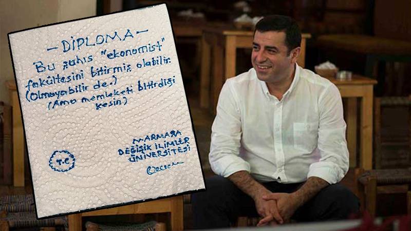 Demirtaş'ın beyaz bir peçeteye Marmara Üniversitesi imzalı yazdığı 'diploma' yazısında, "Bu şahıs, ekonomist fakültesini bitirmiş olabilir, olmayabilir de. Ama memleketi bitirdiği kesin. Türkiye Cumhuriyeti Marmara Değişik İlimler Üniversitesi. İmza." ifadeleri yer aldı.