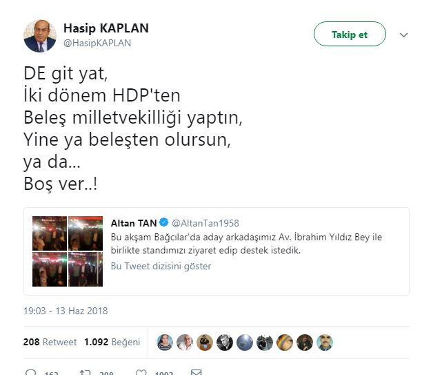 Kaplan, Saadet Partisi’nden milletvekili adayı olan Tan’ın, “Bu akşam Bağcılar’da aday arkadaşımız Av. İbrahim Yıldız Bey ile birlikte standımızı ziyaret edip destek istedik” mesajına, “DE git yat, İki dönem HDP’ten Beleş milletvekilliği yaptın, Yine ya beleşten olursun, ya da… Boş ver..!” şeklinde bir yanıt verdi.