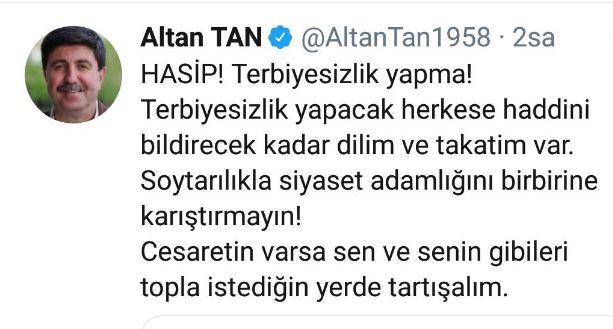 Tan da Kaplan’ın mesajına, “HASİP! Terbiyesizlik yapma! Terbiyesizlik yapacak herkese haddini bildirecek kadar dilim ve takatim var. Soytarılıkla siyaset adamlığını birbirine karıştırmayın! Cesaretin varsa sen ve senin gibileri topla istediğin yerde tartışalım” şeklinde karşılık verdi.