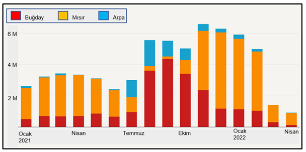Ukrayna’nın 2021-2022 aylık ton olarak ihraç ettiği tahılın, buğday-mısır-arpa, yabancı bir kaynaktan alınan grafiğine bakarsak gelinen noktanın hiç de iç açıcı olduğu söylenemez.