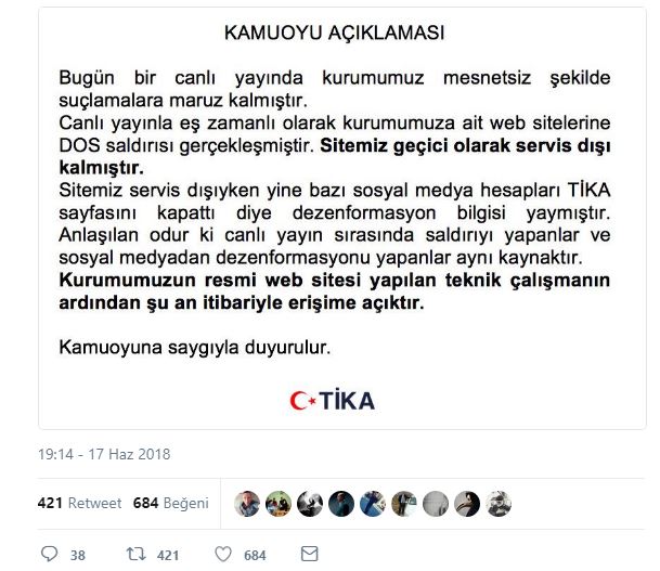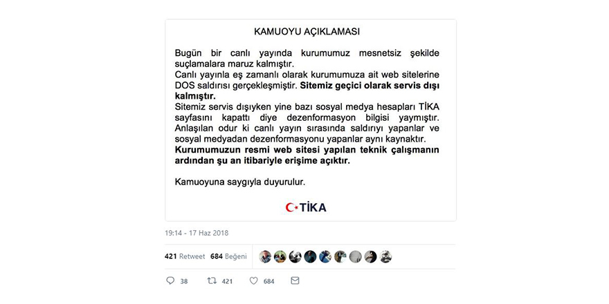 Serdar Çam yaptığı açıklamada, Akşener'in canlı yayınıyla eş zamanlı olarak TİKA'nın web sitesine bir saldırı düzenlendiği ve teknik çalışmalar sonucu bertaraf edildiği öne sürüldü.