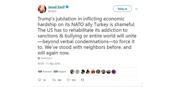 İran Dışişleri Bakanı Muhammed Cevad Zarif, Twitter hesabından yaptığı paylaşımda, “Trump’ın NATO müttefiki Türkiye’ye ekonomik zorlukları coşkuyla dayatması utanç verici. ABD yaptırımlara ve zorbalığa bağımlılığını düzeltmeli aksi takdirde tüm dünya ülkeleri onu zorlamak için sözlü kınamaların ötesine geçecektir. Biz daha önce de komşularımızın yanındaydık şimdi de yanlarında olacağız” ifadelerini kullandı.