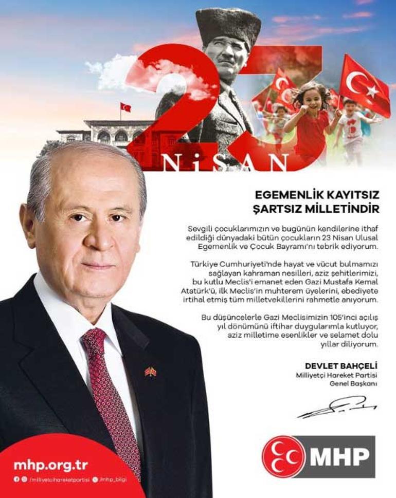 MHP Genel Başkanı Devlet Bahçeli'nin 23 Nisan Ulusal Egemenlik ve Çocuk Bayramı dolayısıyla X’ten paylaştığı mesaj şu şekilde: