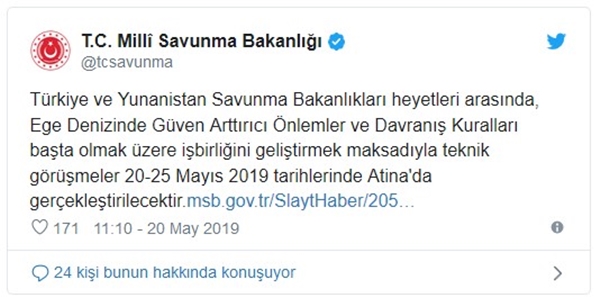 Milli Savunma Bakanlığı tarafından yapılan açıklama, "Türkiye ve Yunanistan Savunma Bakanlıkları heyetleri arasında, Ege Denizinde Güven Arttırıcı Önlemler ve Davranış Kuralları başta olmak üzere işbirliğini geliştirmek üzere teknik görüşmeler 20-25 Mayıs 2019 tarihlerinde Atina'da yapılacaktır.