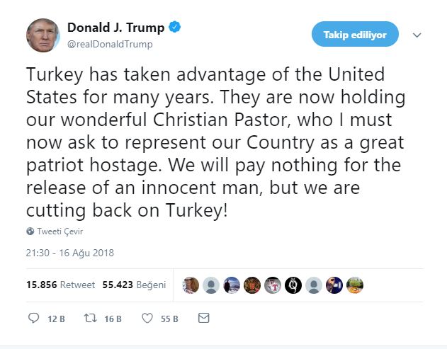 "Türkiye yıllar boyunca ABD'den faydalandı. Şimdi harika bir Hristiyan pastörümüzü tutuyorlar ki ondan ülkemizi büyük bir vatansever rehin olarak temsil etmesini istemek zorundayım. Masum bir insanın serbest bırakılması için hiçbir şey ödemeyeceğiz. Biz Türkiye'den kesintiye gidiyoruz!"