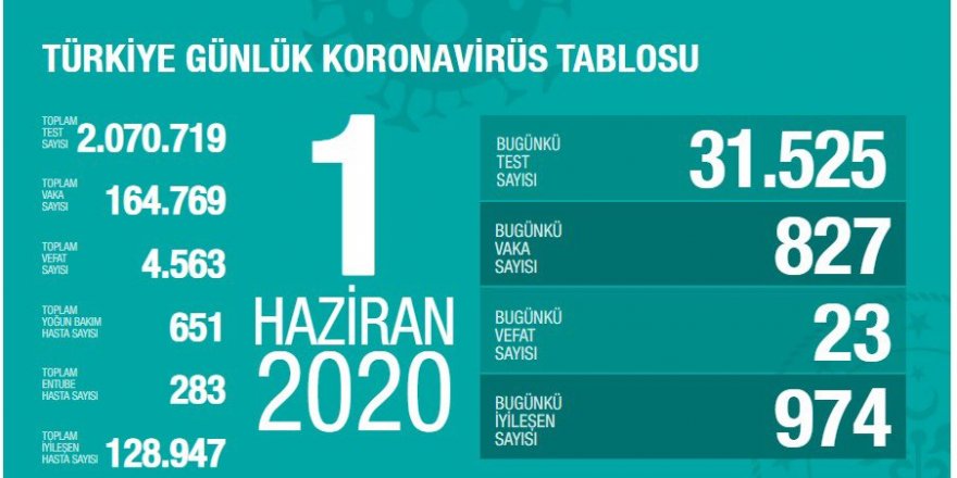 Türkiye'de yeni tip koronavirüs (Kovid-19) salgını nedeniyle hayatını kaybedenlerin sayısı 23 artışla 4 bin 563'a ulaştı. 24 saatte 31 bin 525 test yapıldı ve 827 kişiye tanı kondu.