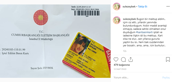 Uzun seneler Kanal D Haber'de görev yapan Şule Zeybek, kişisel sosyal medya hesabından yapmış olduğu açıklamayla, 'Sarı Basın Kartı'nın iptal edildiğini duyurdu.