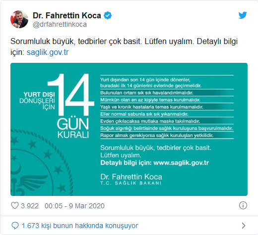 Söz konusu paylaşımda "Sorumluluk büyük, tedbirler çok basit. Lütfen uyalım" çağrısında bulunan Bakan Koca, koronavirüsle ilgili detaylı bilgiye Bakanlığın "www.saglik.gov.tr" internet adresinden ulaşılabileceğini belirtti.